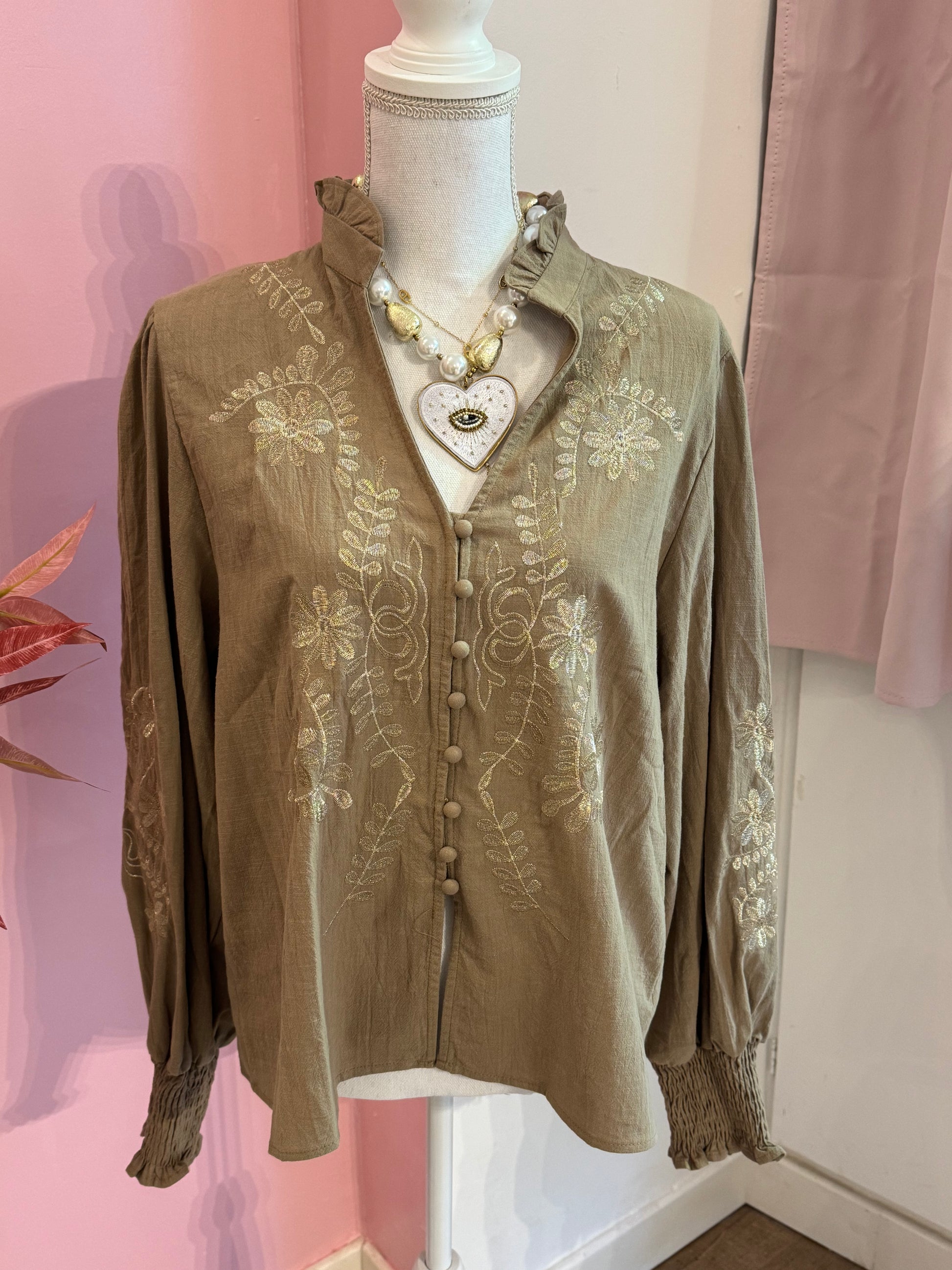 Ce chemisier élégant se distingue par ses broderies dorées délicates, qui ajoutent une touche sophistiquée et lumineuse à vos tenues.