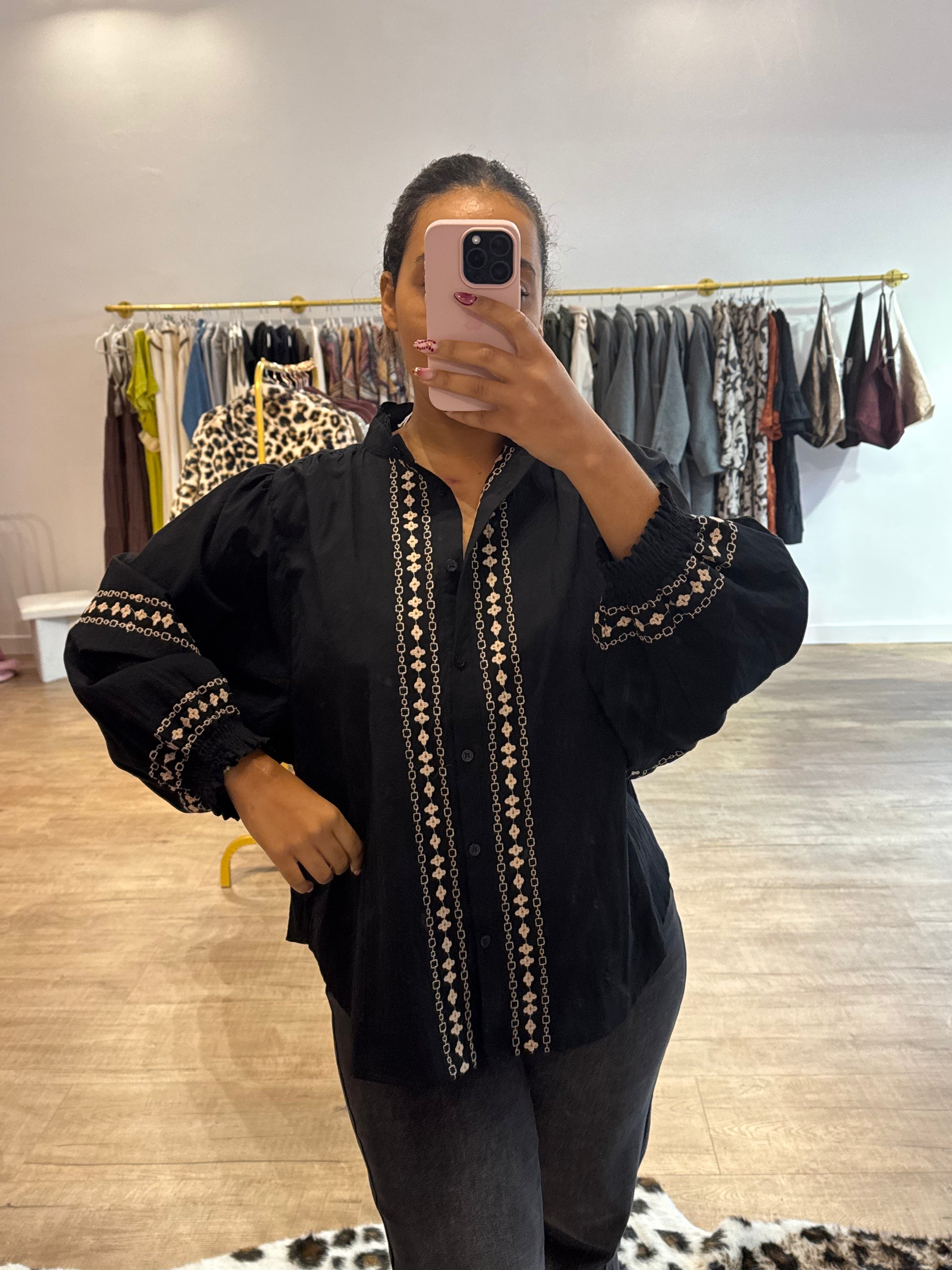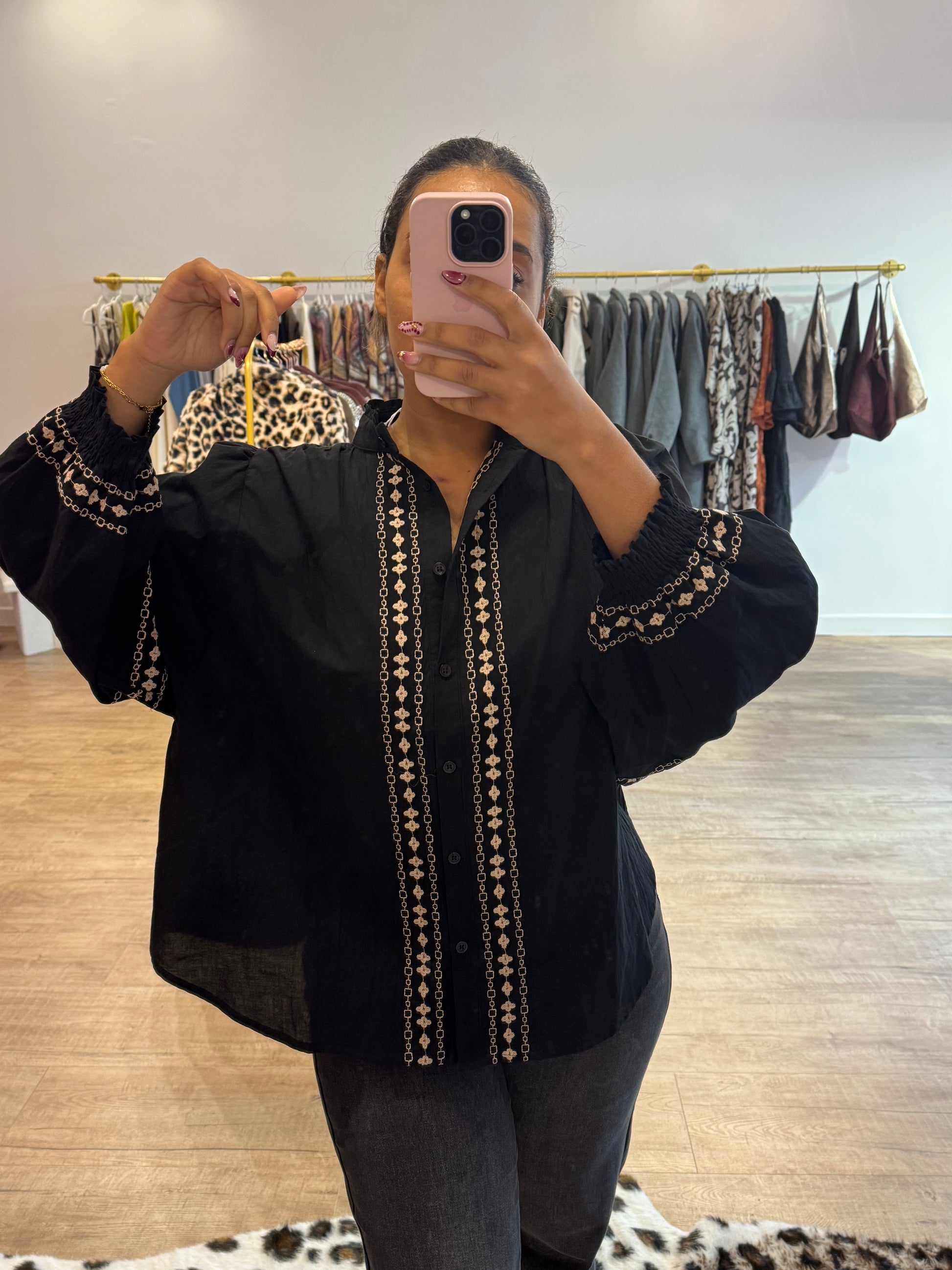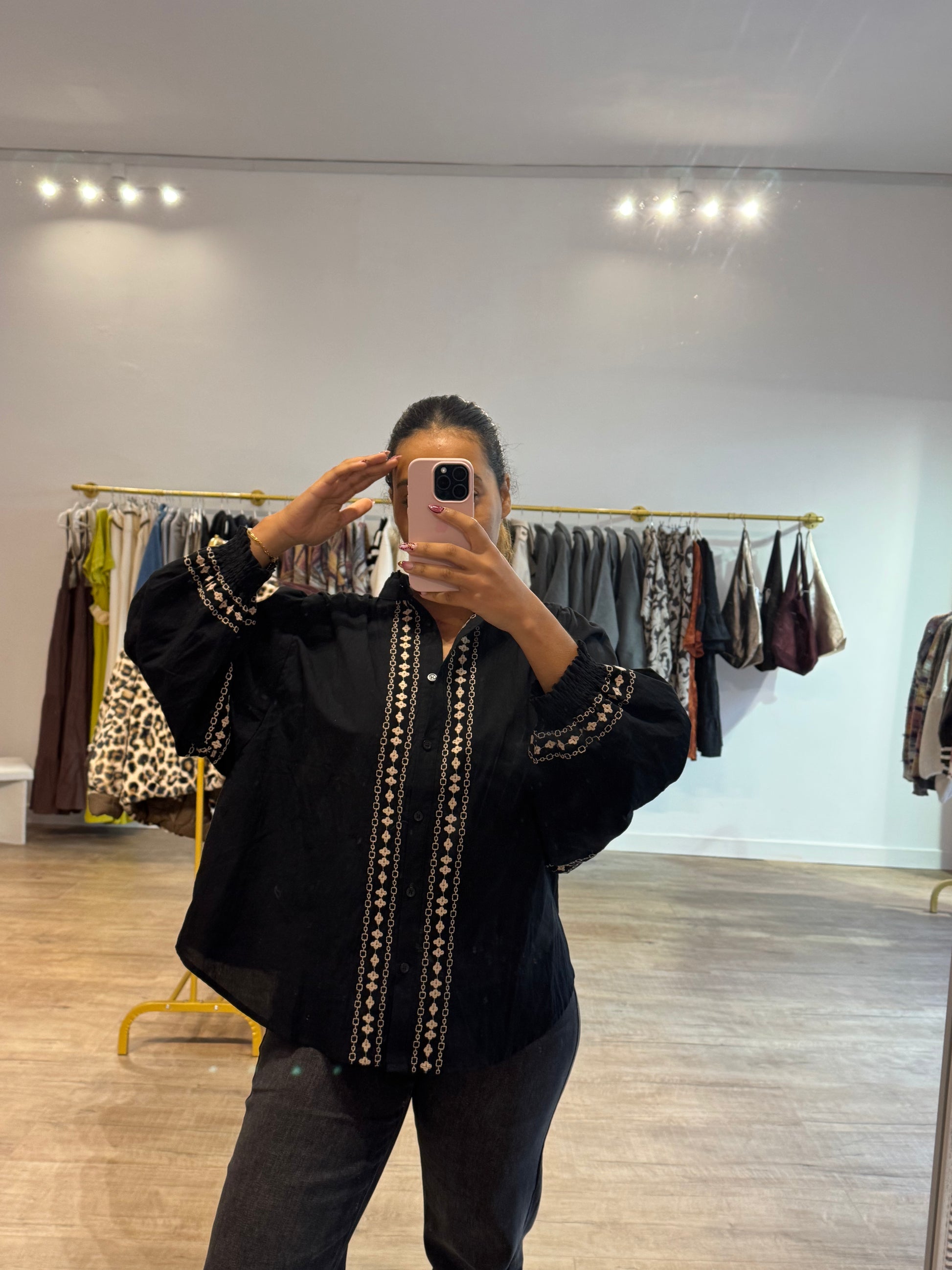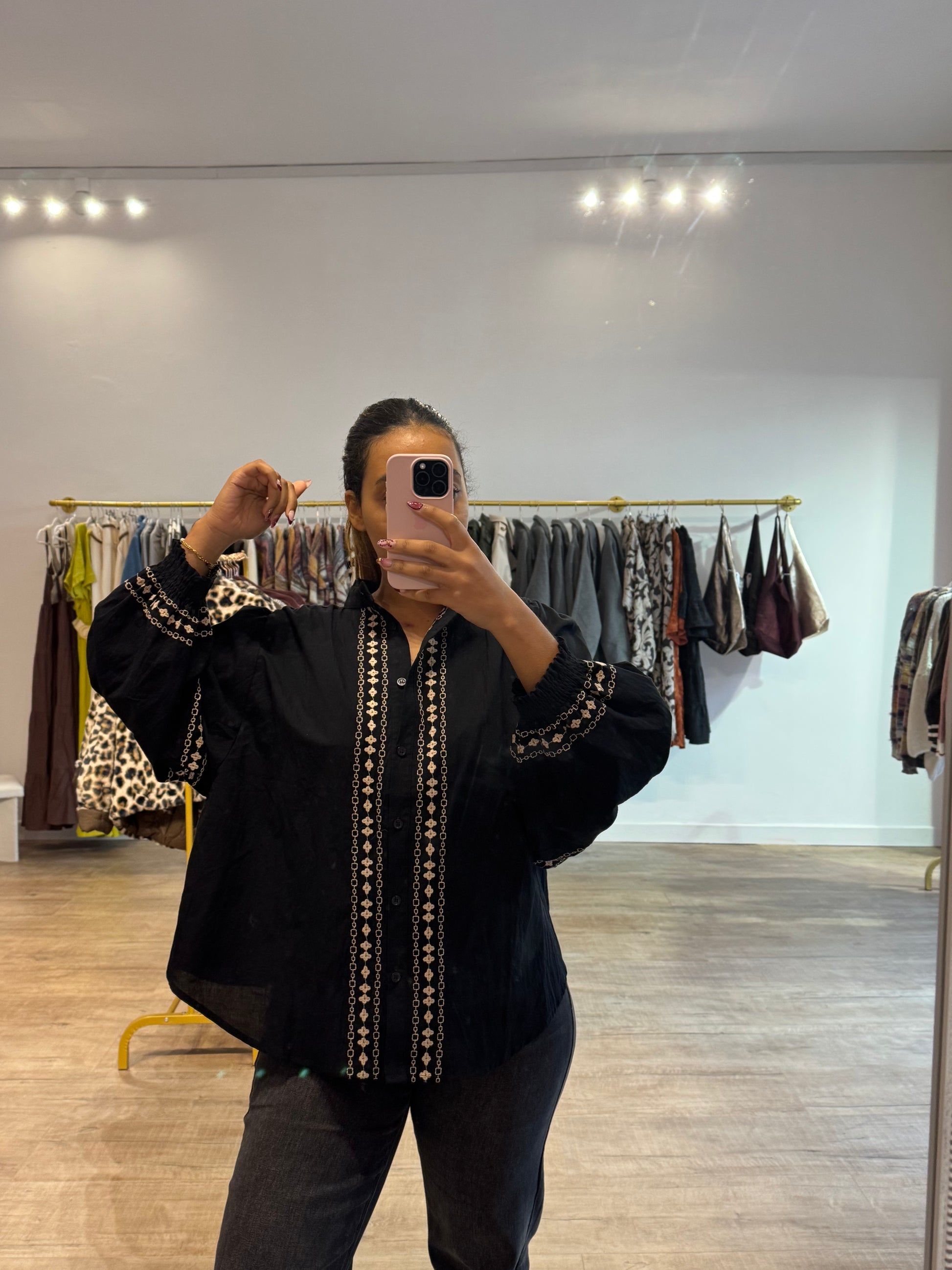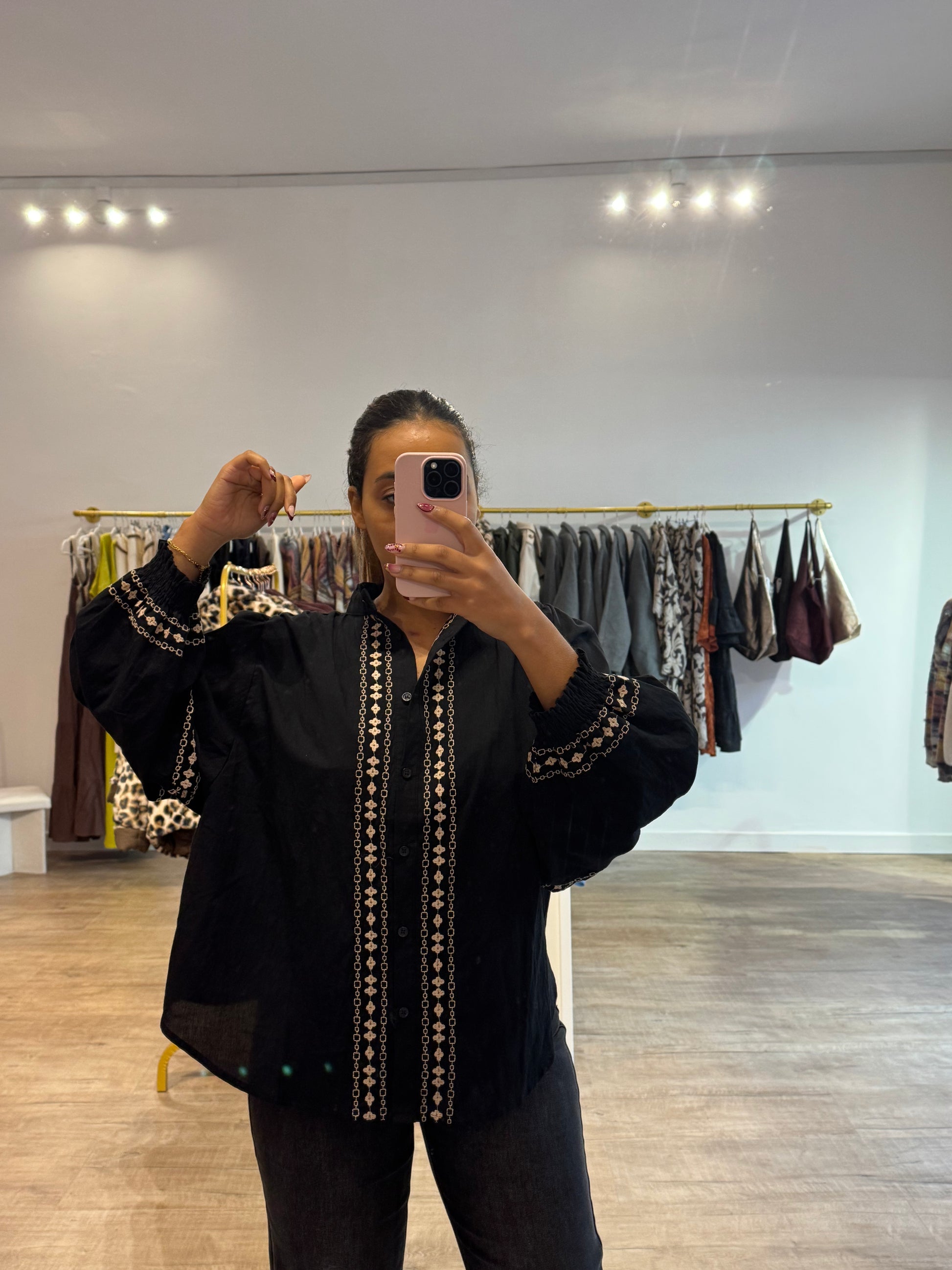 Ce chemisier noir style bohème apporte une touche de liberté et de légèreté à vos tenues grâce à ses motifs délicats.