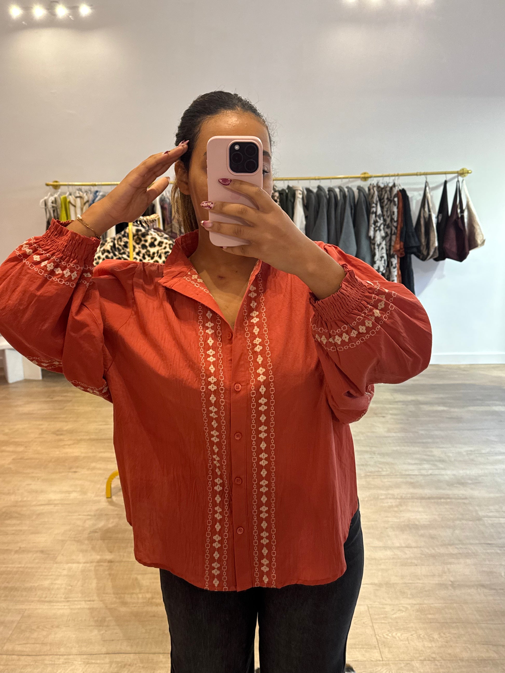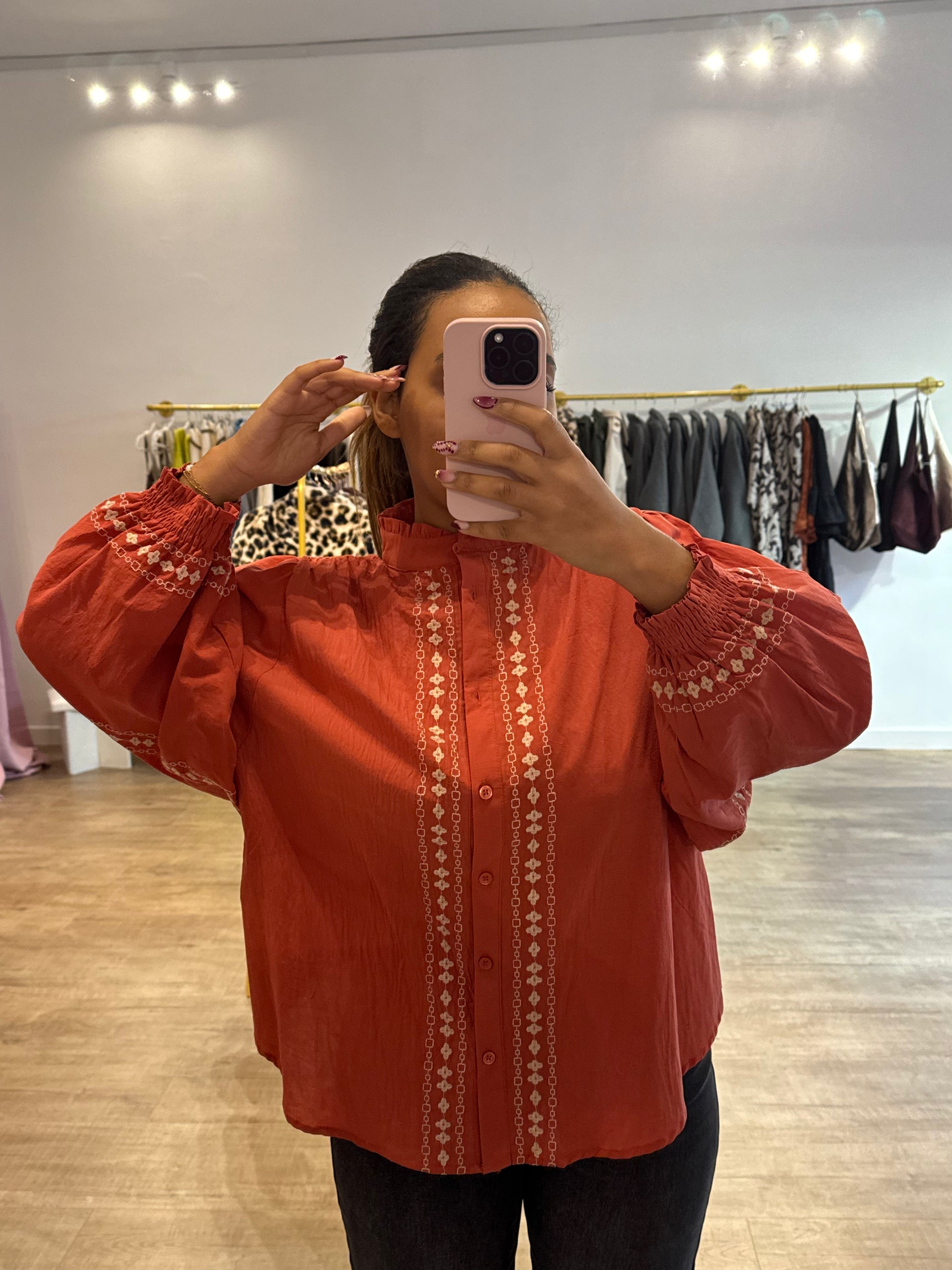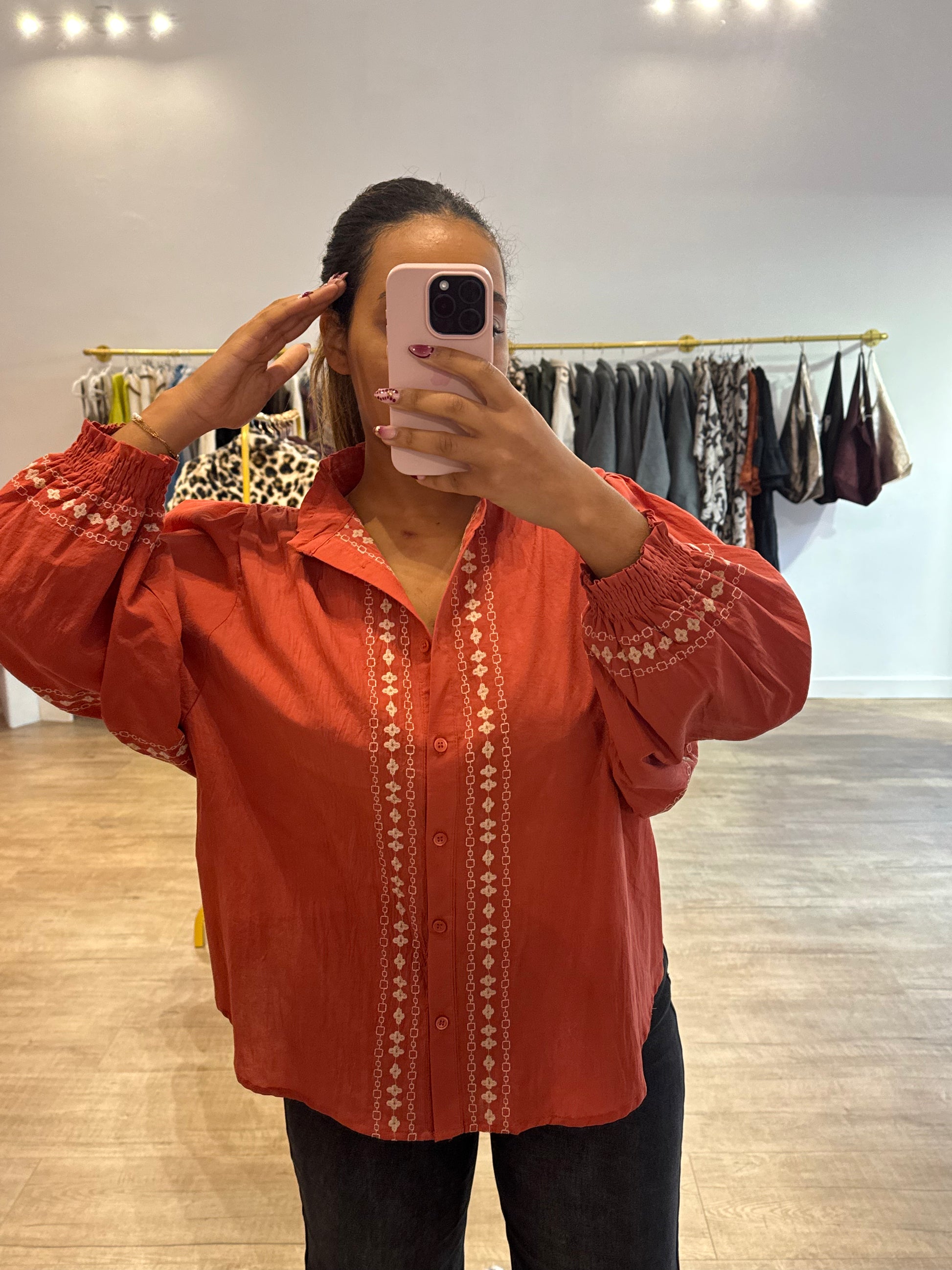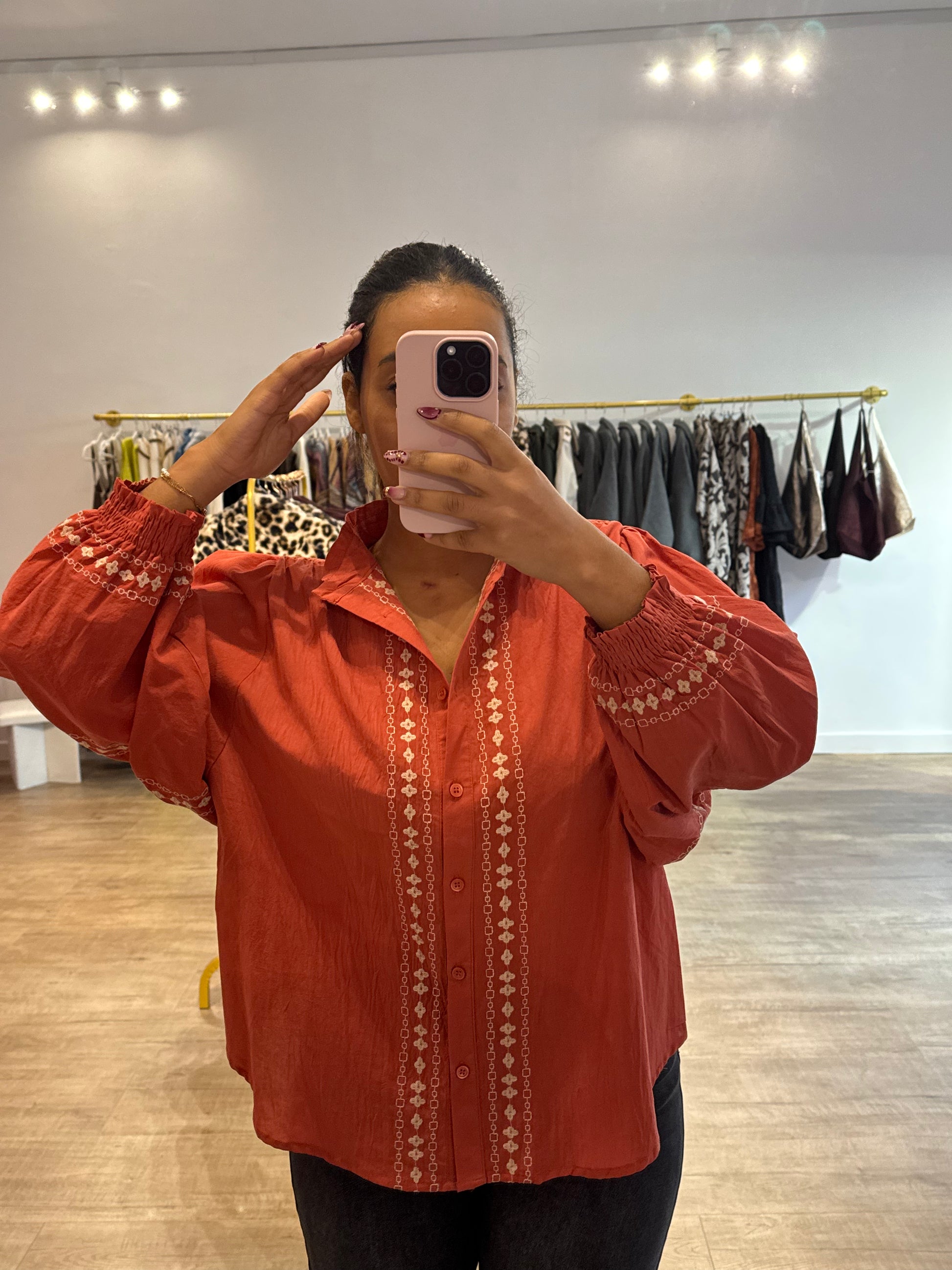 Ce chemisier orange style bohème apporte chaleur et énergie à vos tenues grâce à ses motifs délicats.