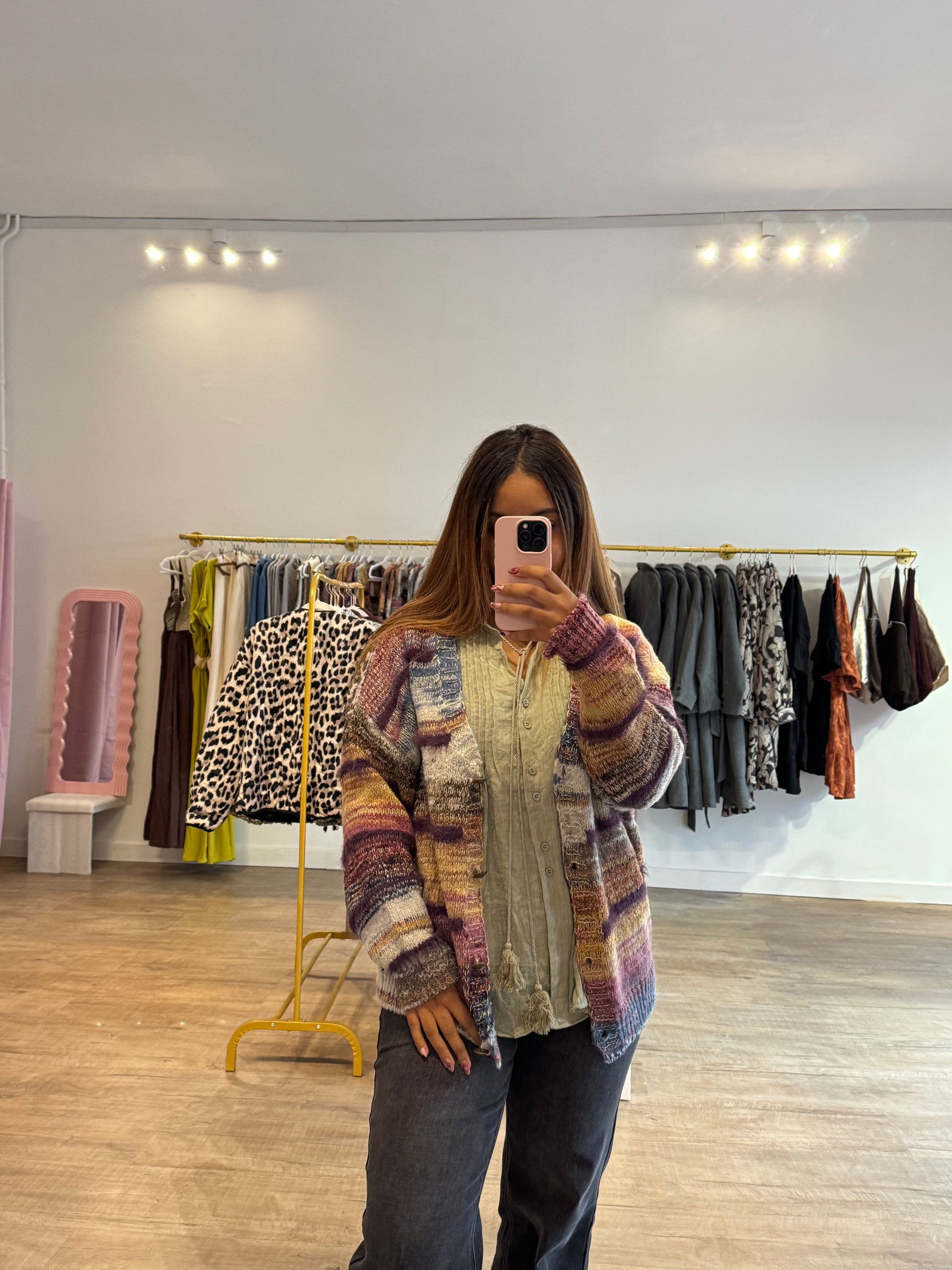 Ses fils pailletés et ses boutons dorés ajoutent une touche d’élégance et de fantaisie, parfaite pour celles qui aiment briller sans en faire trop.