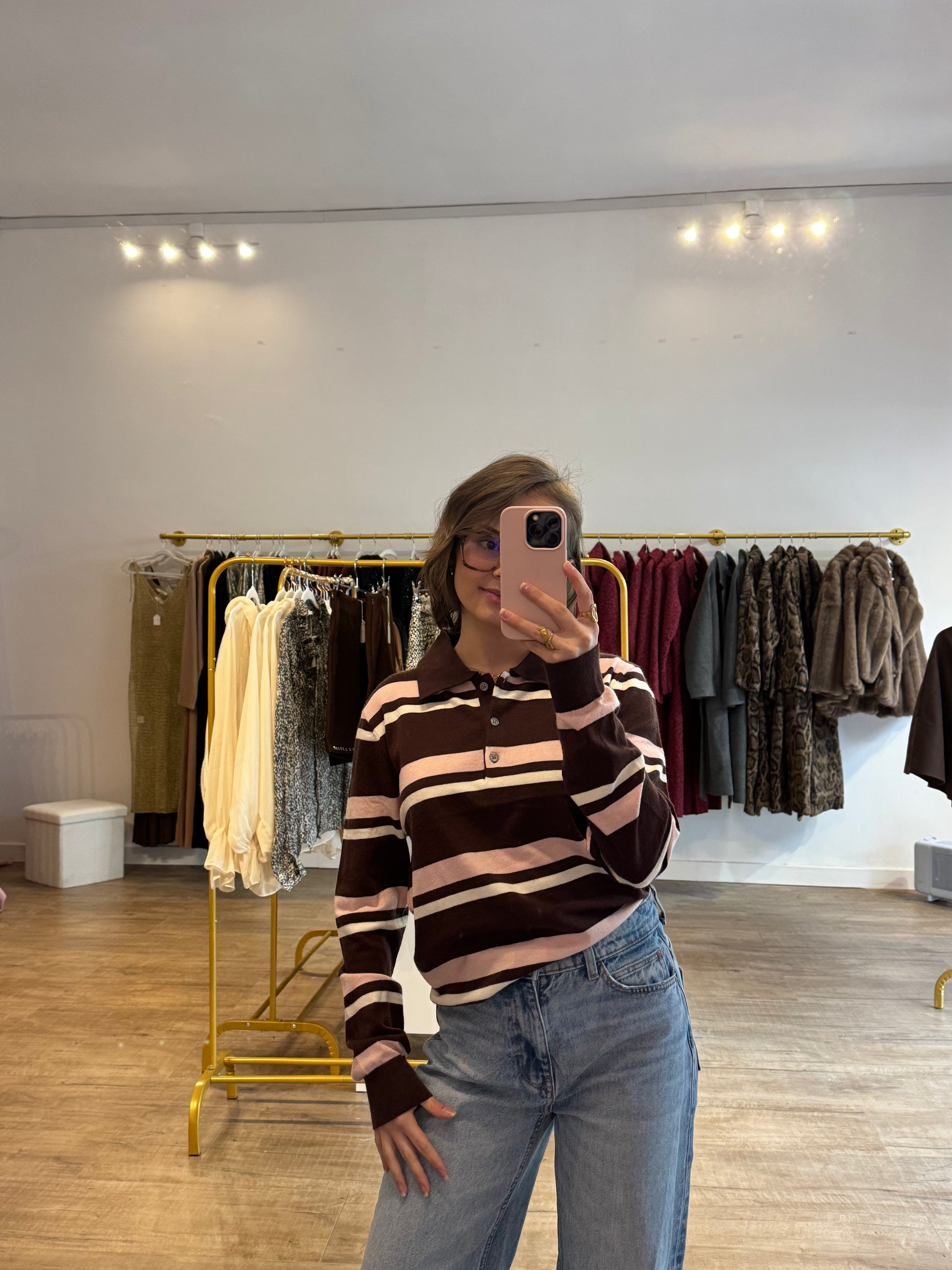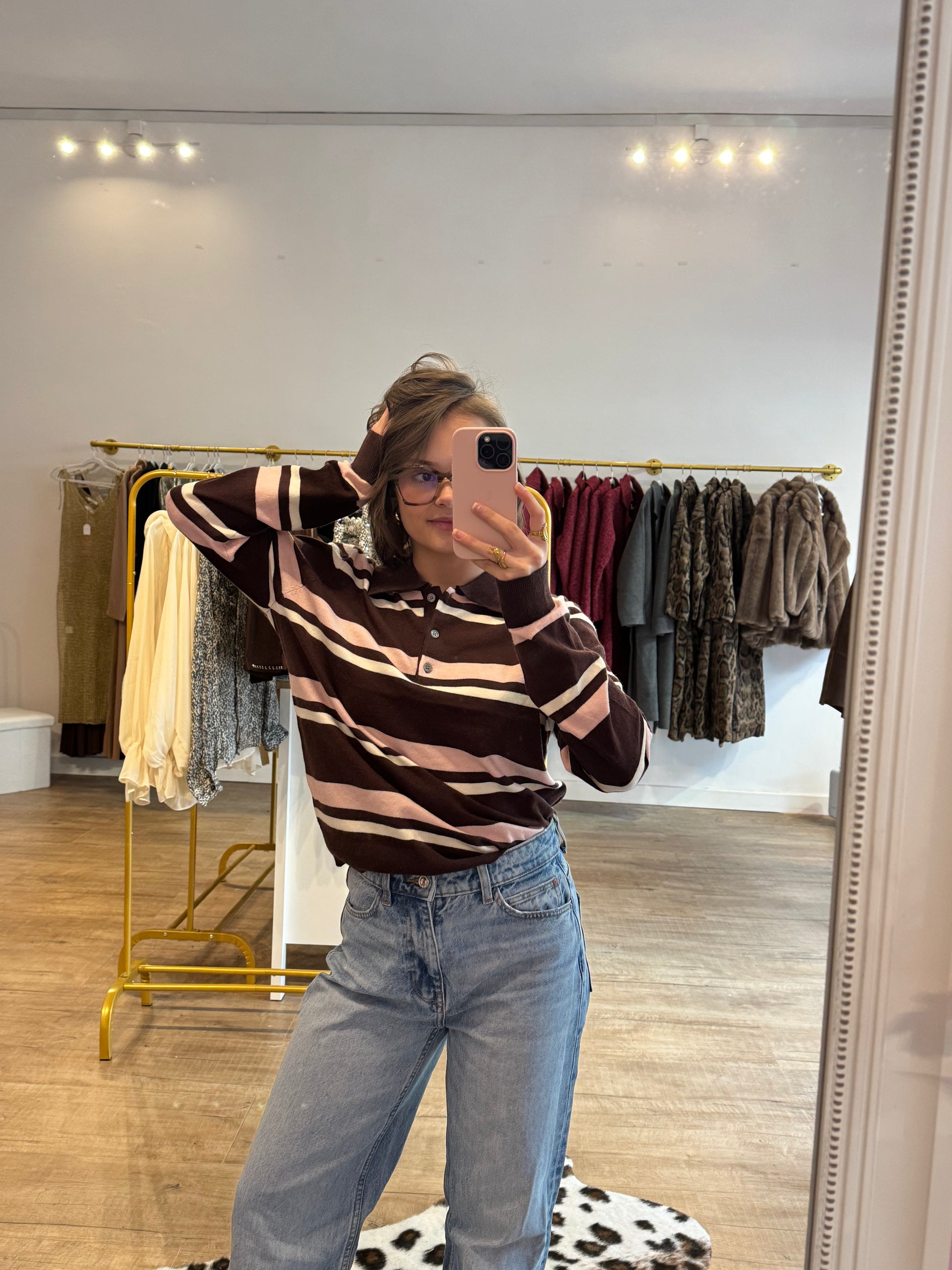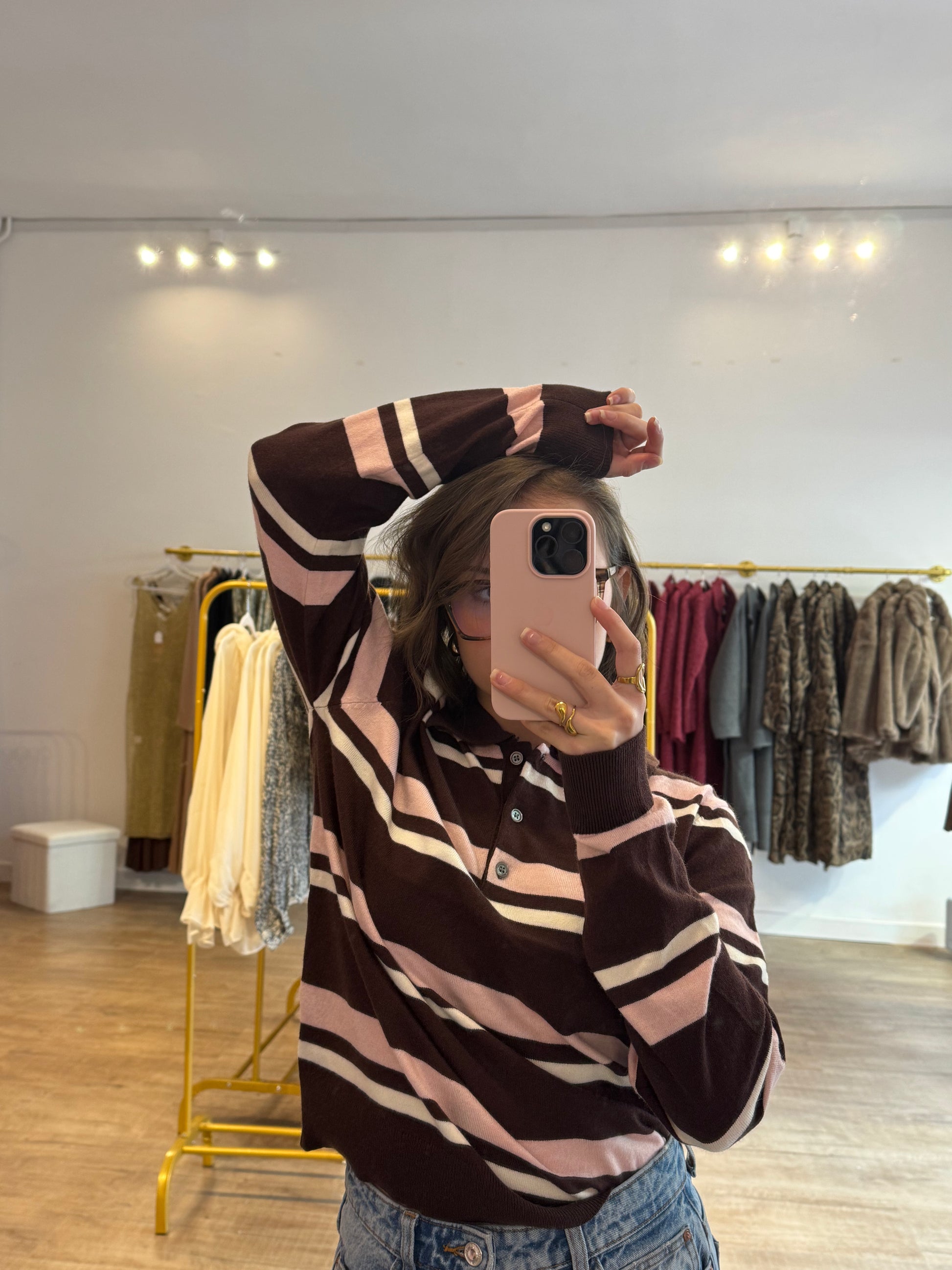 Polo manches longues rayé rose et marron, rétro-chic et confortable. Facile à porter avec jean, jupe ou pantalon, il apporte style et modernité au quotidien.