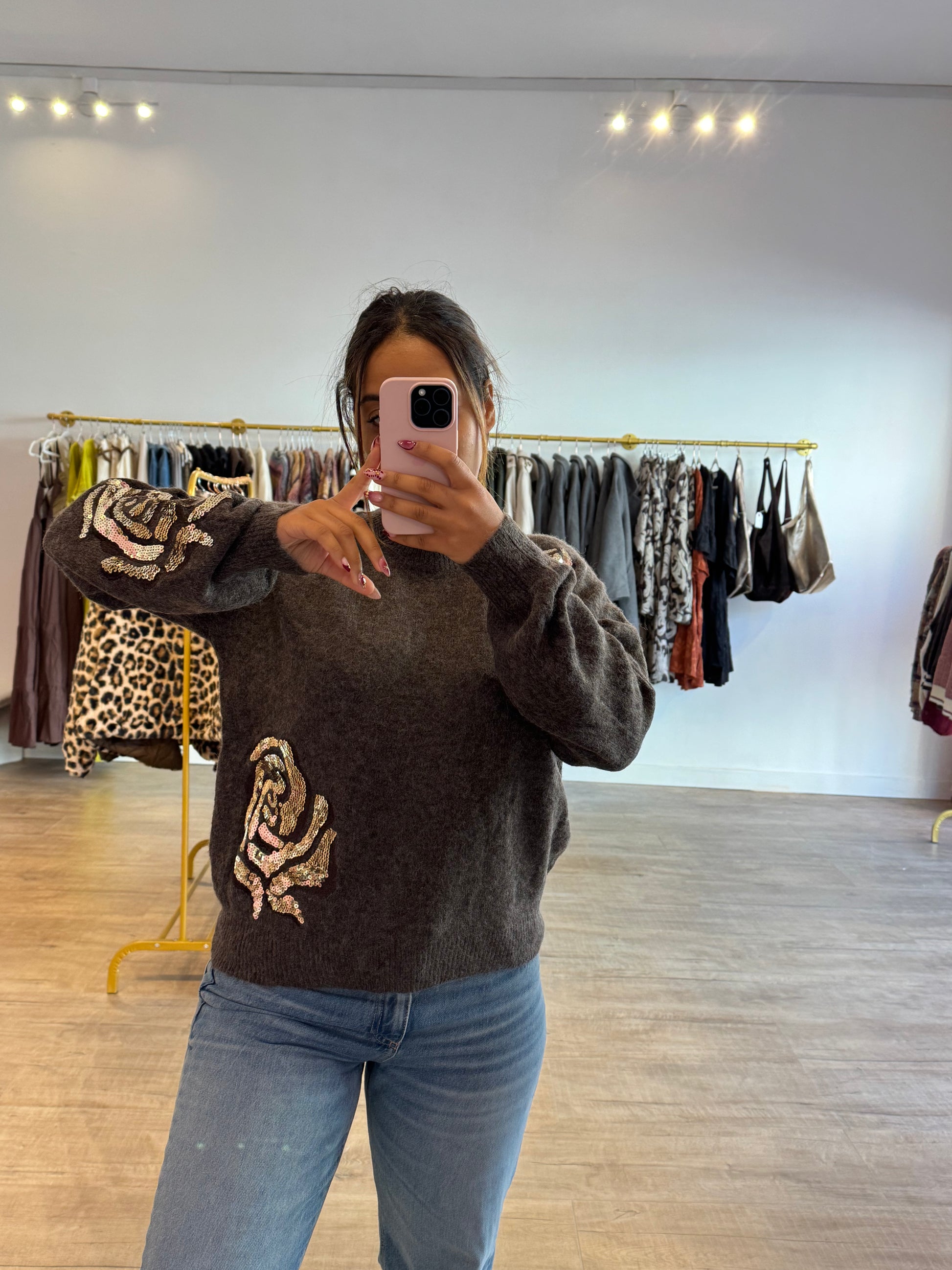 Apportez une touche de brillance discrète à votre look avec notre pull marron orné de détails pailletés dorés. Sa couleur chaleureuse et ses accents scintillants font de cette pièce un incontournable pour un style chic et décontracté à la fois.