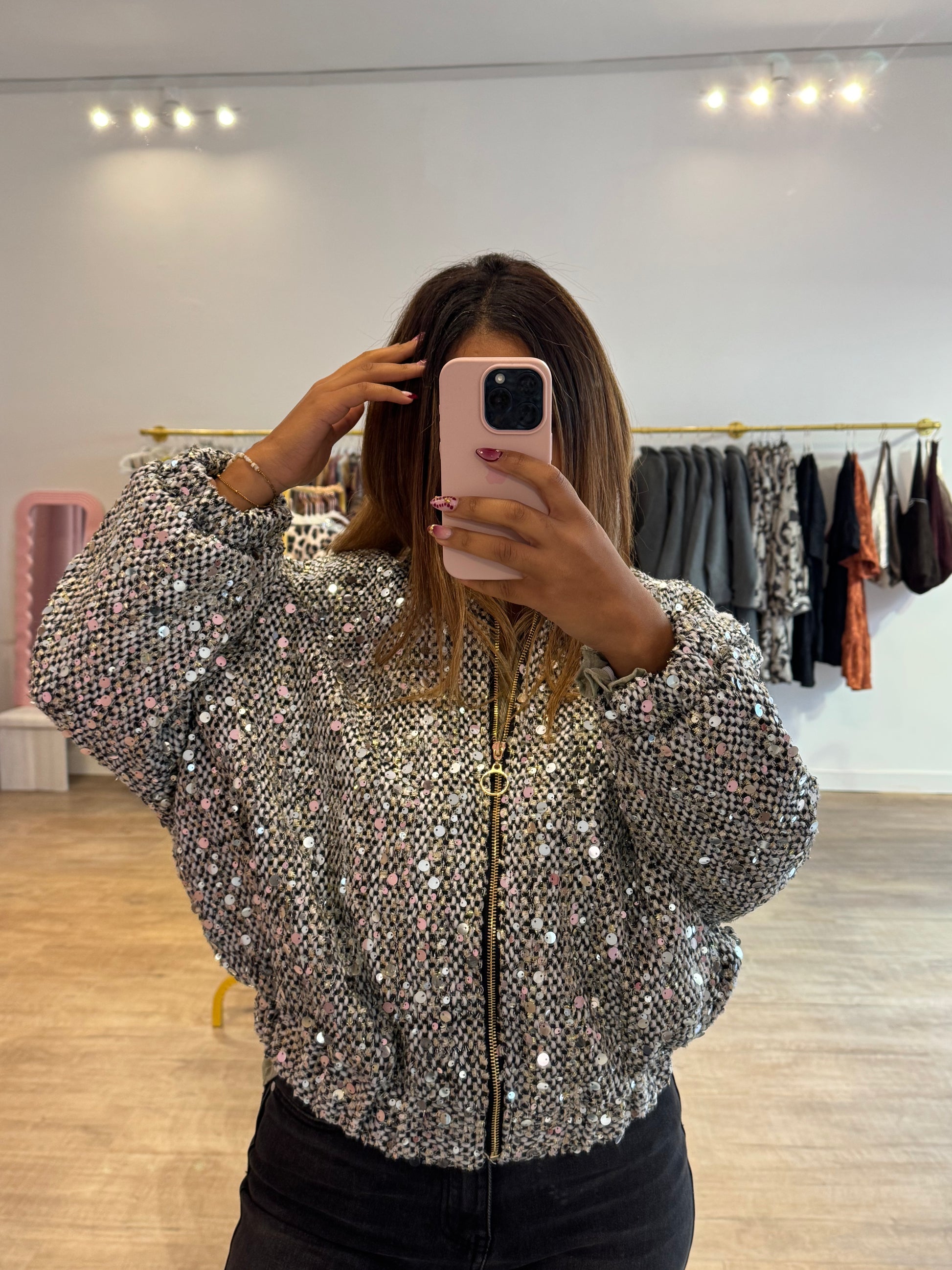 Apportez une touche de glamour et d’audace à vos looks avec notre veste bomber à paillettes. Sa coupe moderne et confortable s’inspire du style intemporel du bomber, tandis que les pailletes étincelantes transforment cette pièce en véritable statement fashion.